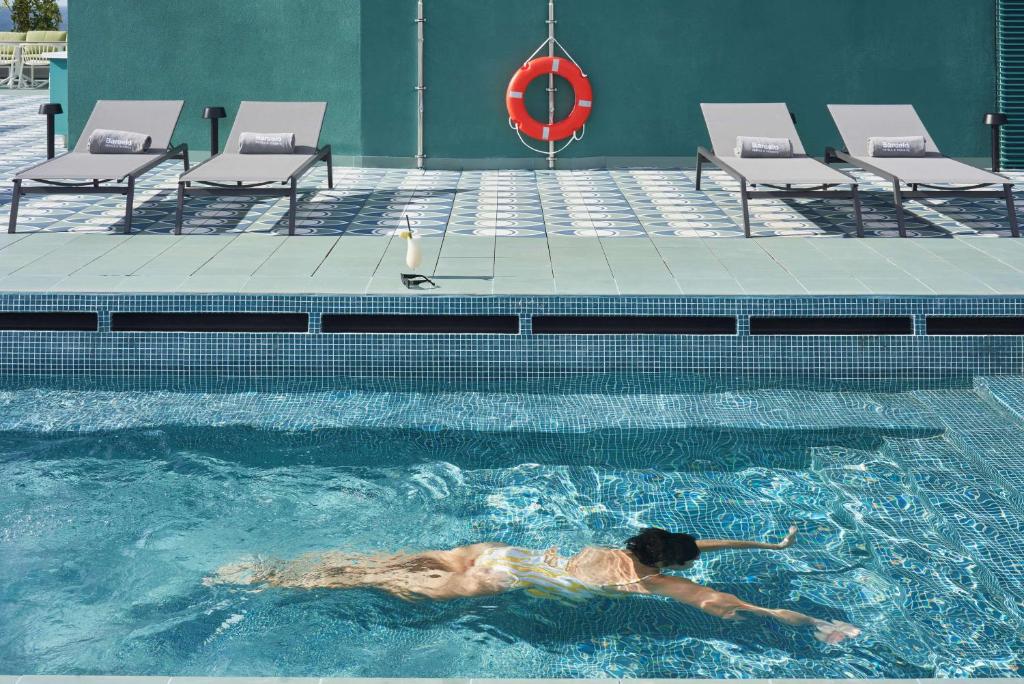 Mūsdienīgas telpas ar jumta bāru un baseinu.